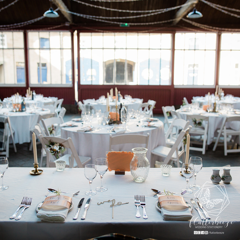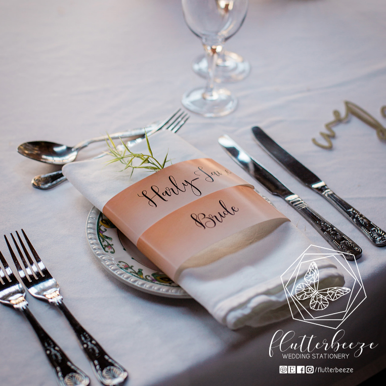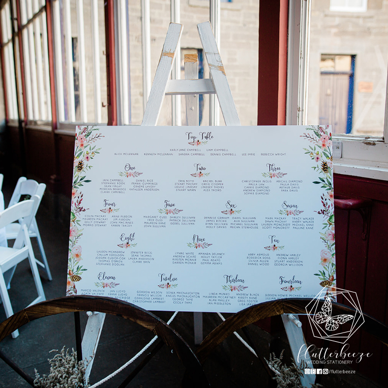 Harly-Jane and Liam later ordered on the day items to match and compliment their invitations. All of the printed items matched the stationery, there was a table plan, menu cards and bellyband placenames.