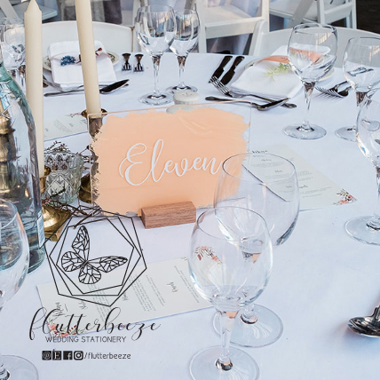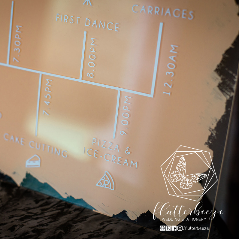 Liam and Harly-Jane were keen to have painted acrylic signage on the day too, we incorporated the coral colour and used a bright white for the text.